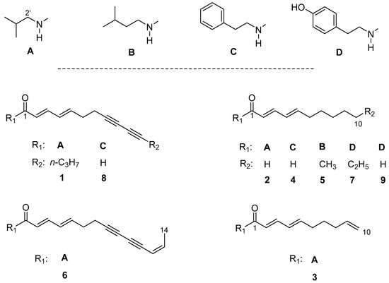 - Kuropka, G.; Glombitza, K.W. Further Polyenic and Polyynic Carboxamides and Sesamin from Achillea ptarmica. Planta Med. 1987, 53, 440–442. [Google Scholar] [CrossRef] [PubMed]