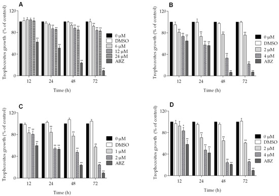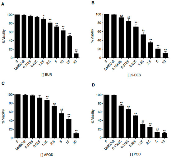 All of the podophyllotoxin-type lignans tested here inhibited the growth of G. lamblia trophozoites to different extents. The inhibitory effects, whose kinetics are shown in Figure 1, revealed a dose-dependent inhibition, with an IC50 value of 4.53 μM for 5-DES, 2.12 μM for APOD, and 3.88 μM for POD (Table 1). BUR caused only a moderate inhibition effect on parasite growth (Figure 1A). The maximal inhibitory effects were observed after 72 h of incubation; at 24 μM, BUR decreased cell growth by 17% (Figure 2A), treatment with 4 μM of 5-DES or POD decreased cell growth by 77% and 75%, respectively (Figure 2B,D), whereas treatment with 2 μM APOD decreased cell growth by 75% (Figure 2C). In addition, the percentage of viable parasites was determined using a trypan blue dye exclusion assay. The incubation of trophozoites with 4 µM of 5-DES or POD caused a decrease in viability percentages of parasites of 67% and 58%, respectively. Treatment with 2 µM APOD resulted in cell viability of 45%, suggesting that APOD is more active against Giardia trophozoites. The group treated with BUR showed no significant changes (Figure 3). Dimethyl sulfoxide (DMSO)-treated cells did not exhibit any significant differences compared with untreated cells.
