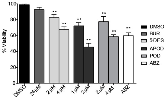 Effect of burseranin (BUR), 5′-desmethoxy-β-peltatin-A-methylether (5-DES), acetylpodophyllotoxin (APOD), podophyllotoxin (POD), and albendazole (ABZ) on Giardia lamblia trophozoite viability after 24 h of treatment: (**p < 0.0001).