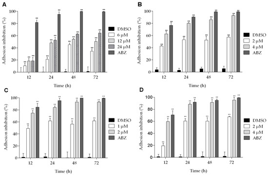 The effects of podophyllotoxin-type lignans on the adherence of trophozoites are shown in Figure 4. All of the lignans tested have an inhibitory effect on Giardia adhesion to different extent, and the maximum effect was observed after 72 h of treatment. At this time, BUR reduced the adhesion of parasites by 64% (Figure 4A). On the other hand, the effect of 5-DES and POD at 4 μM was similar (inhibition of 92% and 95%, respectively) (Figure 4B,D). Meanwhile, APOD caused a more dramatic effect: with 1 μM, the adhesion was reduced by nearly 50% at 12 h, and, with 2 μM, at 72 h the maximal inhibition was observed (93%) (Figure 4C).