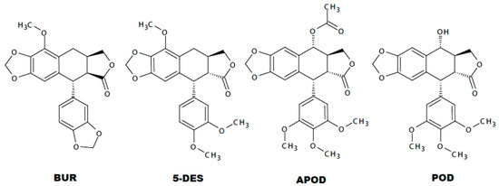 Chemical structure of burseranin (BUR), 5′-desmethoxy-β-peltatin-A-methylether (5DES), acetylpodophyllotoxin (APOD), and podophyllotoxin (POD).
