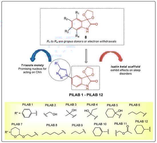Design of isatin-triazoles PILAB 1–PILAB 12 with potential CNS activity, and structure of dioxolane ketal isatin derivatives 8 previously evaluated by our research group.