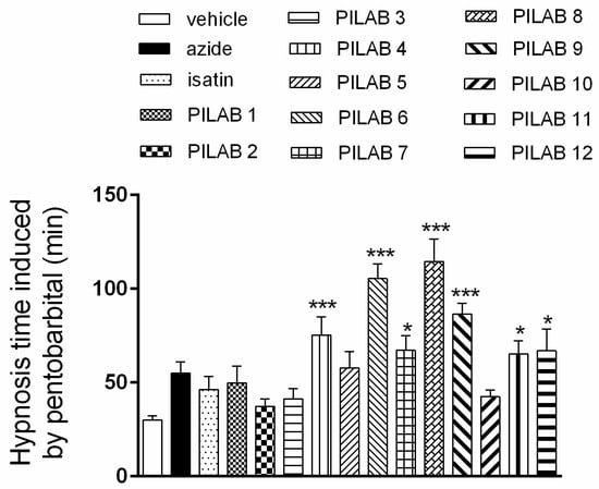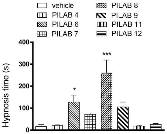 Effect of PILABs (100 μmol/kg) on the duration of pentobarbital-induced sleep. Mice received i.p. injections of the PILABs indicated 30 min prior to an i.v. injection of sodium pentobarbital (20 mg/kg). Hypnosis time was recorded based on the loss and recovery of the righting reflex. Data are expressed as the mean ± SEM (n = 10). * p < 0.05, and *** p < 0.001 compared to the vehicle-treated group, one-way ANOVA followed by Dunnett’s multiple comparison test for parametric measures.
