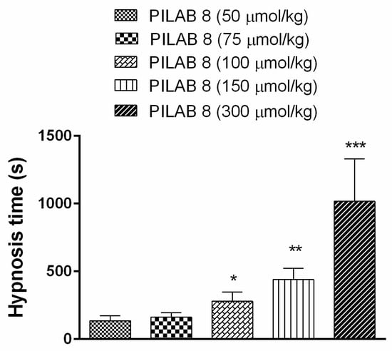 Hypnosis time following the i.v. administration of varying doses of PILAB 8. Time intervals between loss and recovery of the righting reflex were recorded. Data are expressed as the mean ± SEM (n = 6). * p < 0.05 and ** p < 0.01 and *** p < 0.001 compared to PILAB 8 (50 μmol/kg), one-way ANOVA followed by Student’s unpaired t-test.