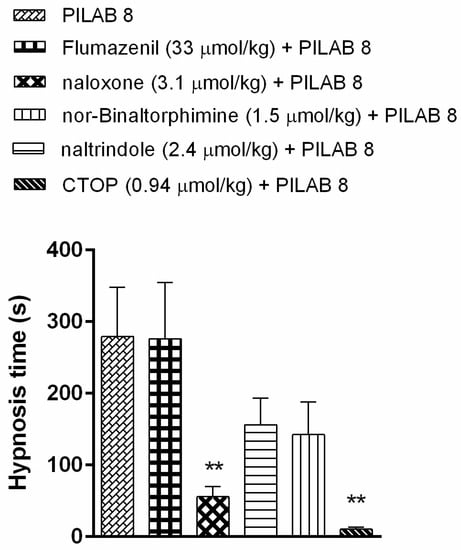 Effects of PILAB 8 (100 μmol/kg) on hypnosis time following pre-treatment with flumazenil (33 μmol/kg), naloxone (3.1 μmol/kg), nor-binaltorphimine (1.5 μmol/kg), naltrindole (2.4 μmol/kg), or CTOP (0.94 μmol/kg). Time intervals between loss and recovery of the righting reflex were recorded. Data are expressed as the mean ± SEM (n = 10). ** p < 0.01 compared to PILAB 8 (100 μmol/kg i.v.), one-way ANOVA followed by Dunnett's multiple comparison test for parametric measures