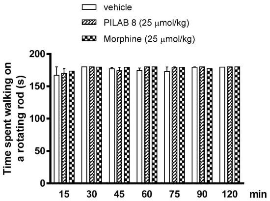 Dunham and Miya described a method for detecting motor harm in response to substances such as skeletal muscle relaxants or CNS depressants [51,52]. A rotarod treadmill (Insight, Model EFF 411, Ribeirão Preto, Brazil) consisting of a bar with a diameter of 2.7 cm and height of 40 cm was subdivided into four compartments by using disks 25 cm in diameter that rotate at 8 revolutions per minute (rpm). Male Swiss mice (20–25 g) were placed on the apparatus in three training sessions 24 h prior to testing as previously described [53]. The mice that could not sustain themselves on the apparatus for more than 90 s were excluded. Motor performance was evaluated based on the time spent walking on a rotating rod (8 rpm) over a 3 min interval at various time points after an i.p. injection (15, 30, 45, 60, 75, 90 and 120 min) of vehicle, PILAB 8 or morphine (25 µmol/kg).