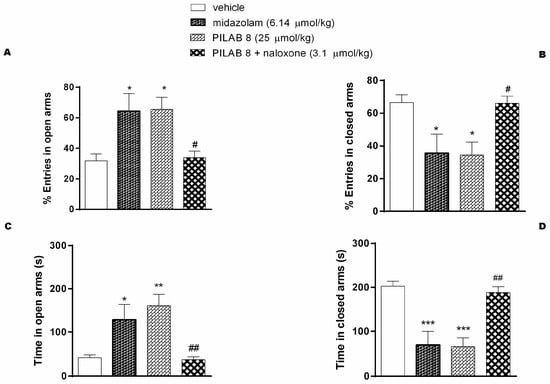 Effects of PILAB 8 (25 μmol/kg) or midazolam (6.15 μmol/kg) with or without prior administration of naloxone (3.1 μmol/kg). The percentage of entries into the open arms (A) and the closed arms (B) of the EPM over a 5 min interval are presented. * p < 0.05, ** p < 0.01, and *** p < 0.001 vs. vehicle; ## p < 0.01 vs. PILAB 8. The time spent in the open arms (C) and the closed arms (D) of the EPM over a 5 min interval. * p < 0.05, ** p < 0.01 and *** p < 0.001 vs. vehicle; # p < 0.05, ## p < 0.01 vs. PILAB 8.