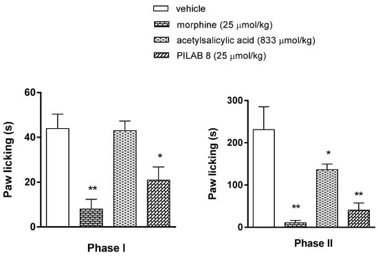 Evaluation of the antinociceptive activity of PILAB 8 (25 μmol/kg i.p.), morphine (25 μmol/kg i.p.) and acetylsalicylic acid (833 μmol/kg i.p.) in the formalin test. Intraperitoneal injections each substance were performed 30 min prior to the injection of formalin and subsequently observed during 30 min. Data are expressed as the mean time of reactivity (time spent licking) ± SEM (n = 10). * p < 0.05 and ** p < 0.01 vs vehicle-treated group, one-way ANOVA followed by Dunnett’s test.