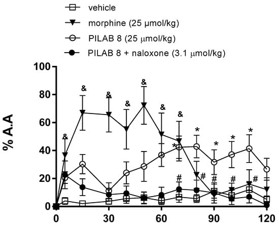 Effects of the intraperitoneal injection of vehicle, PILAB 8 (25 μmol/kg), morphine (25 μmol/kg) and pretreatment with naloxone (3,1 μmol/kg) in animals received PILAB 8 (i.p.) in a hot plate test. Data are expressed as the mean ± SEM (n = 8–10). * p < 0.05 and & p < 0.05 vs. vehicle; # p < 0.05 vs. PILAB 8, one-way ANOVA followed by Dunnett’s test.
