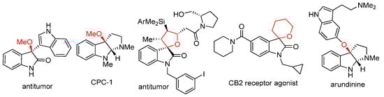 - Badillo, J.J.; Hanhan, N.V.; Franz, A.K. Enantioselective Synthesis of Substituted Oxindoles and Spirooxindoles with Applications in Drug Discovery. Curr. Opin. Drug Discovery Dev. 2010, 13, 758–776. [Google Scholar]