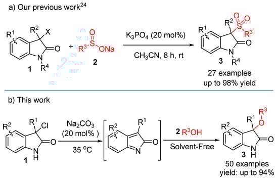 On the other hand, as 3,3′-disubstituted oxindole scaffolds, 3-alkoxylated-2-oxindoles possessing interesting structural properties were found in a number of biologically active synthetic and natural products (Figure 2) [29,30,31,32,33,34,35,36,37] Therefore, methods for alkoxylation of the oxindole nucleus are of value in medicinal chemistry and natural product synthesis. Over the past several years, although many synthetic methods have been developed for the synthesis of 3-hydroxy-2-oxindoles, existing catalytic syntheses of substituted 3-alkoxylated-2-oxindoles from simple substrates and catalysts are very few [38,39,40,41]. Worthy of note is that in 1964, Hinman and Bauman, et al. reported only a single example that described the synthesis of 3-methoxy-3-methyloxindole from 3-bromo-3-methyloxindole by treatment with 1 equivalent of NaHCO3 in MeOH/water (10/1). Prompted by this precedent, we have recently expanded the scope of this type of electrophile to synthesize a wide variety of 3-sulfonylated 3,3-disubstituted oxindole derivatives (Scheme 1) [21]. In this context, considering the high solubility of HCl in the alcoholic solvent, we supposed that a stoichiometric amount of base may be not necessary in alkoxylation of 3-halooxindoles in alcoholic solvents. We present herein the use of alcohols as both the substrates and solvents for the synthesis of 3-alkoxylated-2-oxindoles by direct alkoxylation of 3-halooxindoles using a catalytic amount of base.