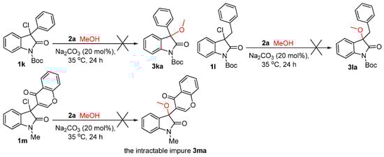 The generality of the reaction was further demonstrated by using a variety of alcohols 2, clearly indicating that all of the reactions proceeded smoothly under the optimal conditions, producing the desired products 3 in moderate to good yields (Table 2, 3ab–3ah), regardless of the electronic nature of the chloroxindoles 1. It is noteworthy that the bulky isopropyl alcohol (2d) led to deleterious effects on the reactivity, affording the desired products in moderate yields (Table 2, 3dd–3gd). In addition, our attempts to identify the alkoxylation reactions of 3-aryl or 3-arylmethyl substituted N-Boc-oxindoles 1 using MeOH as substrate and solvent were in vain (Scheme 2). Furthermore, using 3-aryl substituted N-Me-oxindole 1m as substrate it proved difficult to obtain the pure compound 1ma, and we always obtained an intractable product mixture (Scheme 2).