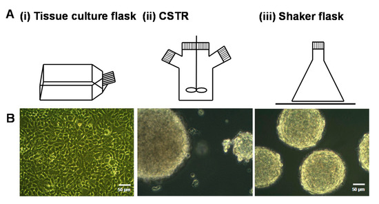 (A) Schematic of different bioreactors used to culture the HEK-293 cells expressing serglycin including (i) tissue culture flasks, (ii) continuously stirred tank reactors (CSTR), and (iii) shaker flasks; and (B) phase contrast images of cells after three days of culture in the different bioreactor conditions. The scale bar represents 50 μm.