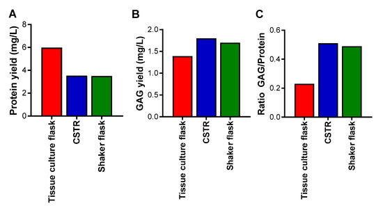 The influence of the different bioreactors on the cells was also analyzed in terms of yield of proteins and glycosaminoglycans after enrichment of the conditioned medium by anion exchange chromatography for proteoglycans, of which the major proteoglycan produced by these cells was serglycin. The highest yield of proteins was obtained from the tissue culture flasks, followed by the CSTR, and then the shaker flasks, which demonstrated the lowest yield (Figure 3A). The highest yield of glycosaminoglycans was obtained from the CSTR and shaker flasks, and the lowest yield of glycosaminoglycans was obtained from the tissue culture flasks (Figure 3B). Analysis of the ratio of glycosaminoglycan to protein yields indicated that the CSTR and shaker flasks produced the highest amount, and the tissue culture flasks the least (Figure 3C). These data suggest that the spheroid cultures reduced cell proliferation and encouraged glycosaminoglycan decoration of the serglycin protein core to a greater extent than tissue culture flasks that encouraged cell proliferation and protein production.