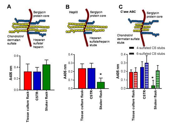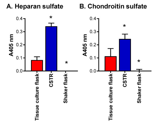 The effect of the different bioreactors was further assessed by analyzing the sub-structure of the heparan and chondroitin sulfate chains produced by ELISA (Figure 5). Interestingly, the CSTR promoted the production of heparan sulfate chains containing N-acetylated glucosamine resides, as detected using the heparan sulfate chain antibody, to a significantly greater (p < 0.05) extent than either the tissue culture flasks or the shaker flasks (Figure 5A). Together with the data presented in Figure 4B, this indicated that the tissue culture flasks promoted heparan sulfate/heparin chains with a different structure to the CSTR as they exhibited the same level of heparan sulfate/heparin chains. It is speculated that the tissue culture flasks promoted heparan sulfate/heparin chains with sulfated disaccharides, as observed previously [1]. The shaker flasks facilitated minimal heparan sulfate/heparin chain production with no detectable heparan sulfate chains using the heparan sulfate chain antibody (Figure 5A). Both the tissue culture flasks and the CSTR supported the production of chondroitin sulfate containing type A and C disaccharides, while the shaker flask did not support the production of this type of chondroitin sulfate chain (Figure 5B). These data align with the level of 4-sulfated chondroitin sulfate stub structures detected in each of the cultures (Figure 4C).