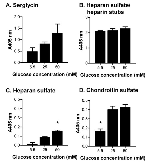 The level of glucose in the culture medium has been reported to affect cell proliferation [32], as well as protein production and glycosylation [33,34,35,36]. A comparison of the results of this study and a previous study by the authors indicated that changes in the method of culture in tissue culture flasks is sufficient to alter both serglycin protein core production and the type of glycosaminoglycans [1]. Previously, the cells were cultured for seven days in tissue culture flasks in medium containing 5.5, 25, or 50 mM glucose, passaged weekly and fed every three days. These conditions indicated that the level of glucose in the medium affected both serglycin and heparin/heparan sulfate production [1]. In contrast, this study, cells were grown for three days in tissue culture flasks in medium containing 5.5, 25, or 50 mM glucose prior to passaging, demonstrated that the level of glucose in the medium also affected chondroitin sulfate production.