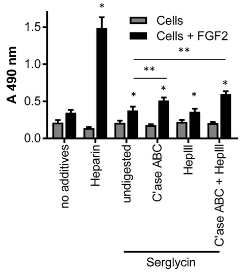 Activity of serglycin with heparin/heparan sulfate and chondroitin sulfate chains determined by the signaling of FGF receptor type 1c expressing BaF32 cells in the presence of FGF-2 as mesured by the MTS assay. Cells in the presence of FGF-2 and heparin were used as a control for the formation of active ternary complexes. Negative controls were cells in the presence of no additives, heparin, or FGF-2. Selected serglycin preparations were digested with either chondroitinase ABC, hepIII or both glycosaminoglycan lysases prior to the assay. Cell proliferation was measured after 72 h. * indicated significant differences (p < 0.05) within treatments for cells and FGF-2 compared to cells only as determined by a one-way ANOVA; ** indicated significant differences (p < 0.05) as determined by two-way ANOVA.
