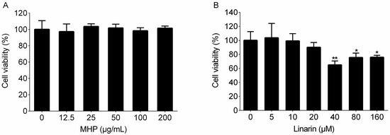 Effects of MHP and linarin on the viability of RAW264.7 cells. (A) The cells were treated with MHP (0, 12.5, 25, 50, 100, and 200 μg/mL) for 24 h; (B) The cells were treated with linarin (0, 5, 10, 20, 40, 80, and 160 μM) for 24 h. Cell viability was determined by the 3-(4,5-dimethylthiazol-2-yl)-2,5-diphenyltetrazolium bromide (MTT) assay. The data shown are representative of three experiments and expressed as mean ± SD. * p < 0.05 and ** p < 0.01 versus the normal control group.
