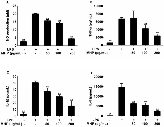 Effect of MHP on the production of nitric oxide (NO), tumor necrosis factor-α (TNF-α), interlenkin-1β (IL-1β), and IL-6 in LPS-induced RAW264.7 cells. The cells were pretreated with MHP (50, 100, and 200 μg/mL) for 1 h, and then were stimulated with LPS (1.0 μg/mL) for 24 h. The level of NO (A) in the supernatant was determined using the nitric oxide assay kit. The levels of TNF-α (B), IL-1β (C), and IL-6 (D) in the supernatant were assayed using enzyme-linked immunosorbent assay (ELISA) kits. The data shown are representative of three experiments and expressed as mean ± SD. ** p < 0.01 versus the group treated with LPS alone.