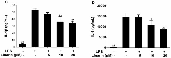Effect of linarin on the production of NO, TNF-α, IL-1β and IL-6 in LPS-induced RAW264.7 cells. The cells were pretreated with linarin (5, 10, and 20 μM) for 1 h, and then were stimulated with LPS (1.0 μg/mL) for 24 h. The level of NO (A) in the supernatant was determined using the nitric oxide assay kit. The levels of TNF-α (B), IL-1β (C), and IL-6 (D) in the supernatant were assayed using ELISA kits. The data shown are representative of three experiments and expressed as mean ± SD. * p < 0.05 and ** p < 0.01 versus the group treated with LPS alone.