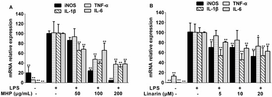 Effects of MHP and linarin on the mRNA expression of inducible NO synthase (iNOS), TNF-α, IL-1β, and IL-6 in LPS-induced RAW264.7 cells. (A) The cells were pretreated with MHP (50, 100, and 200 μg/mL) for 1 h, and then were stimulated with LPS (1.0 μg/mL) for 24 h. (B) The cells were pretreated with linarin (5, 10, and 20 μM) for 1 h, and then were stimulated with LPS (1.0 μg/mL) for 24 h. The mRNA expression levels of iNOS, TNF-α, IL-1β, and IL-6 were measured by quantitative real time polymerase chain reaction (qRT-PCR). Glyceraldehyde 3-phosphate dehydrogenase (GAPDH) was used as the internal control. The data shown are representative of three experiments and expressed as mean ± SD. * p < 0.05 and ** p < 0.01 versus the group treated with LPS alone.