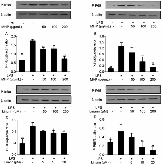 Effects of MHP and linarin on the nuclear factor kappa B (NF-κB) signaling pathway in LPS-induced RAW264.7 cells. (A,B) The cells were pretreated with MHP (50, 100, and 200 μg/mL) for 4 h, and then were stimulated with LPS (1.0 μg/mL) for 30 min; (C,D) The cells were pretreated with linarin (5, 10, and 20 μM) for 4 h, and then were stimulated with LPS (1.0 μg/mL) for 30 min. The levels of phosphorylated inhibitor kappa B α (p-IκBα) and p-p65 were detected by Western blot analysis. β-actin was used as the internal control. The data shown are representative of three experiments and expressed as mean ± SD. * p <0.05 and ** p < 0.01 versus the group treated with LPS alone.