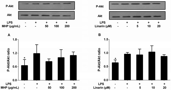 A previous study has reported that activated Akt, a key protein of the PI3K signaling pathway, could turn on the activation of NF-κB [12]. Thus, we investigated the inhibitory effects of MHP and linarin on LPS-induced expression of phosphorylated Akt protein in RAW264.7 cells. However, the results shown in Figure 7A,B indicate that MHP and linarin exerted no inhibitory effect on the LPS-induced increase of the phosphorylation level of Akt.