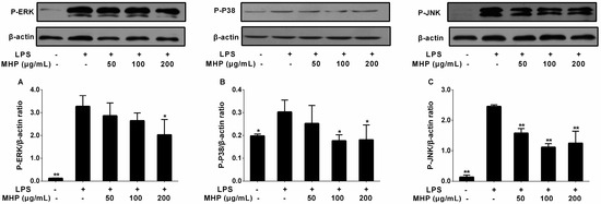 Effects of MHP and linarin on the mitogen-activated protein kinase (MAPK) signaling pathway in LPS-induced RAW264.7 cells. (A–C) The cells were pretreated with MHP (50, 100, and 200 μg/mL) for 4 h, and then were stimulated with LPS (1.0 μg/mL) for 30 min. (D–F) The cells were pretreated with linarin (5, 10, and 20 μM) for 4 h, and then were stimulated with LPS (1.0 μg/mL) for 30 min. The levels of the phosphorylated extracellular signal-regulated kinase (ERK), p38, and c-Jun NH2-terminal kinase (JNK) were detected by Western blot analysis. β-actin was used as the internal control. The data shown are representative of three experiments and expressed as mean ± SD. * p < 0.05 and ** p < 0.01 versus the group treated with LPS alone.