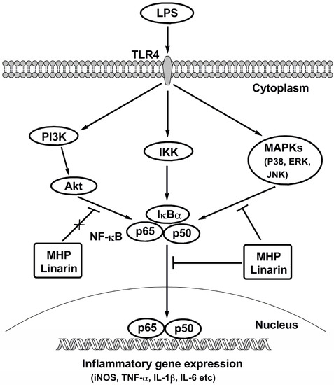 In addition to the NF-κB pathway, the PI3K/Akt and MAPK pathways play essential roles in regulating inflammatory cytokine production in macrophages. It has been reported that Akt and MAPKs were involved in the activation of NF-κB [56,57]. Akt is a key downsteam protein of PI3K and shows diverse roles in cellular growth, adhesion, and inflammation responses [58]. However, our finding showed that LPS-induced phosphorylated Akt was not blocked by MHP. Rosmarinic acid and linarin were two main constituents of MHP. In the previous study of the molecular mechanism of melanogenesis, rosmarinic acid did not reduce Akt phosphorylation in B16 melanoma cells [59]. The results of the present study also demonstrated that linarin displayed no significant inhibitory effect on the phosphorylated Akt. These results suggest that other signaling pathways may be involved in the anti-inflammatory mechanisms of MHP and linarin. Therefore, the impacts of MHP and linarin on MAPKs were further investigated. MAPKs including JNK, p38, and ERK are reported to be closely associated with diverse cellular processes, such as differentiation, proliferation, apoptosis, and immune responses [60]. In general, mitogen and differentiation signals are able to activate the ERK while stress stimuli activate p38 and JNK [61]. Many studies have illustrated that the up-regulation of TNF-α, IL-1β, and IL-6 is diminished by phytochemicals through the inhibition of the activation of ERK, JNK, and p38 [6,62]. In this paper, MHP and linarin down-regulated the phosphorylation levels of ERK, JNK, and p38. Taken together, these findings show that MHP and linarin could inhibit the activation of the NF-κB pathway via suppressing MAPKs activities.