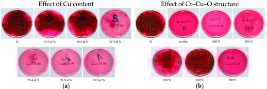 Photos of Petri dishes with evolution of colony-forming units (CFUs) of the Escherichia coli bacteria cultivated on Endo agar covered with bacterial suspension, which was in contact with (a) the pure Si substrate and the as-deposited Cr–Cu–O coating with increasing Cu content on Si substrate and (b) the thermally annealed Cr–Cu–O coating with 20 at.% Cu as a function of the annealing temperature, in the dark for 5 h. Reprinted from [29], Copyright 2013, with permission from Elsevier.