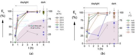 - The efficiency Ek of E. coli bacteria killing on the surface of the Cr–Cu–O coating with ≥ 15 at.% Cu content is the same both in the daylight and in the dark at the contact time t = 5 h (Figure 2a,b). It means that no special irradiation, not even daylight irradiation, is necessary to kill E. coli bacteria settled on the surface of the Cr–Cu–O coating.