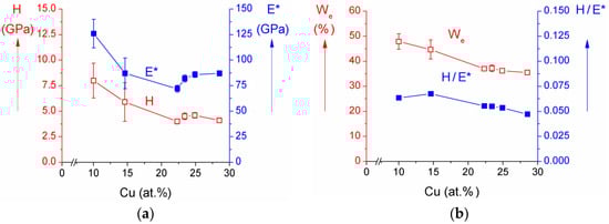 (a) Hardness H, effective Young’s modulus E*; and (b) elastic recovery We and H/E* ratio of Zr–Cu–N coatings sputtered on Si (100) substrates as a function of Cu content. Reprinted from [38], Copyright 2015, with permission from AIP Publishing LLC.