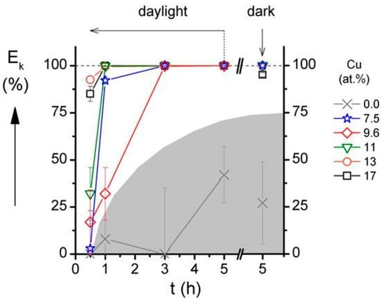 - The efficiency Ek of the bacteria killing is the same in the day light and in the dark. It was confirmed by the measurement of Ek in the dark at contact time t = 5 h, see Figure 4.