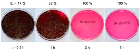 Photos of Petri dishes with the E. coli bacteria cultivated on Endo agar covered with bacterial suspension which was in contact with the surface of an Al–Cu–N coating containing 9.6 at.% Cu for different contact times. Reprinted from [37], Copyright 2015, with permission from Elsevier.