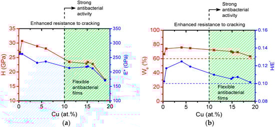 The mechanical properties of antibacterial Me–Cu–N coatings are illustrated on mechanical properties of the Zr–Cu–N coatings, see Figure 6. In this figure (a) the hardness H, effective Young’s modulus E* and (b) the elastic recovery We and the H/E* ratio are displayed as a function of Cu content in the Zr–Cu–N coating. To see the interrelationship between the mechanical and antibacterial properties of Zr–Cu–N coatings, the region of Cu content in which the coatings exhibit a strong antibacterial activity (100% killing of all E. coli bacteria) is marked by dashed lines and in green.