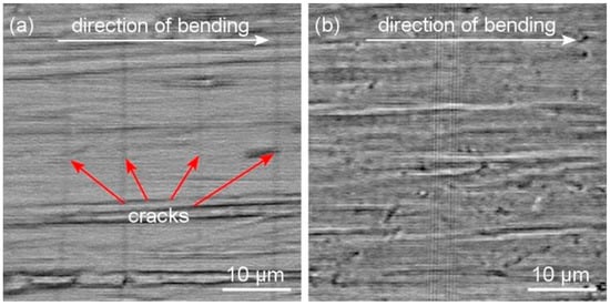 Optical microscope (OM) images of the surface morphology of the Zr–Cu–N coating with (a) a low resistance to cracking (H/E* = 0.082 and We = 56%) and (b) an enhanced resistance to cracking (H/E* = 0.112 and We = 70%) sputtered on Mo strip after bending around a fixed cylinder of radius rfc = 10 mm. Reprinted from [38], Copyright 2015, with permission from AIP Publishing LLC.