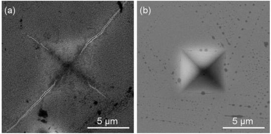 Scanning electron microscopy (SEM) images of the surface morphology of the Zr–Cu–N coating with (a) a low resistance to cracking (H/E* = 0.082 and We = 56%) and (b) an enhanced resistance to cracking (H/E* = 0.112 and We = 70%) sputtered on Si (100) substrate after indentation by the diamond indenter at high load L = 1 N. Reprinted from [38], Copyright 2015, with permission from AIP Publishing LLC.5. Comparison of Antibacterial Cr–Cu–O and Zr–Cu–N Coatings
