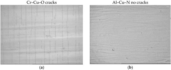 These conclusions were fully confirmed in bending of both coatings deposited on thin Mo strip, see Figure 9. In this test, the coated Mo strip was bent around a cylinder of radius rfc = 10 mm. Clear cracks perpendicular to the bending direction are created in the Cr–Cu–O coating which demonstrate that this coating is brittle. On the other hand, no cracks are formed in the flexible Al–Cu–N coating, see Figure 9.