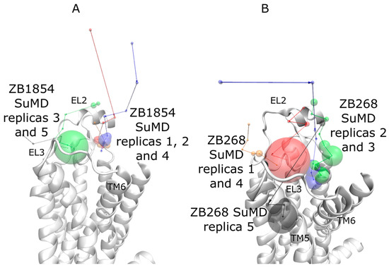 Recognition pathways, according to five SuMD replicas for (A) ZB1854-A2A AR; (B) ZB268-A2A AR. Segments approximate the ligands’ trajectories, while the diameters of the spheres are proportional to the SuMD simulation time spent by the ligand in the corresponding position. Replica 1 is red color coded; replica 2 is blue color coded; replica 3 is green color coded; replica 4 is orange color coded; replica 5 is black color coded.