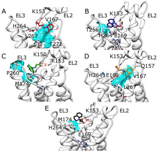Five putative allosteric sites detected at the end of SuMD simulations for ZB268 (NECA is present in the orthosteric site). Polar interactions are highlighted as dotted lines, while the main hydrophobic contacts are depicted as cyan transparent surfaces. (A) Replica 1; (B) replica 2; (C) replica 3; (D) replica 4; (E) replica 5.