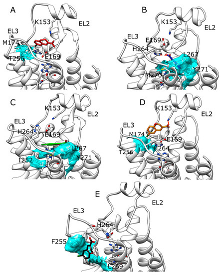 ZB1854 five putative allosteric sites detected during SuMD simulations (NECA is present in the orthosteric site). Polar interactions are highlighted as dotted lines, while the main hydrophobic contacts are depicted as cyan transparent surfaces. (A) Replica 1; (B) replica 2; (C) replica 3; (D) replica 4; (E) replica 5.