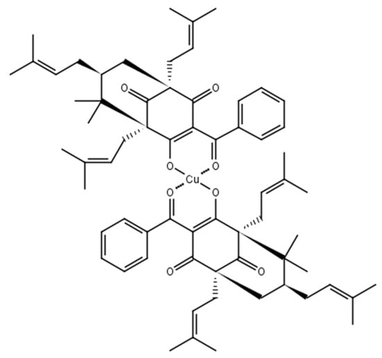 The complex of 7-epi with Cu2+ [3-benzoyl-4-hydroxy-6,6-dimethyl−1,5,7-tris(e-methyl-2-butenyl)bicycle[3.3.1]non-3-ene-2,9-dione-copper], with the molecular formula C66H82CuO8, is a new compound obtained from 7-epi. The compound 7-epi was isolated and characterized by X-ray diffraction by Santos [6,51]. For the synthesis of 7-epi-Cu, 7-epi was weighed out, dissolved in ethanol, and added to potassium bicarbonate. The potassium bicarbonate ionized the benzophenone, which is a weak acid (pKa = 3.756) [52], and increased complexation. The metal ion Cu2+ was added to ionize the chelator molecule and there was a large excess of metal relative to benzophenone, which shifted the equilibrium toward complex formation. It was extremely important that there was no water in the solution because potassium bicarbonate reacts directly with water in a process called “hydrolysis” to produce hydroxyls that compete with the benzophenone for complexation with the metal. Subsequently the solution was filtered to remove excess potassium bicarbonate and chloroform was added. At that time, the ethanol was extracted with water in a funnel. At this stage, water did not affect the complexation because there was no excess of sodium bicarbonate to hydrolyze it, and also the whole complex was transferred to the chloroform phase. The chloroform phase was evaporated to obtain the complex. The compound 7-epi-Cu (Figure 2) was characterized by elemental analysis (CHN), atomic absorption, TG, IR, NMR, UV-VIS spectroscopy and [α]D.