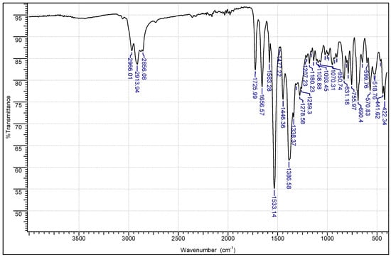 The vibrational IR spectrum (Figure 3) of 7-epi-Cu showed absorption bands in the high-frequency region of the spectrum at 2966 cm−1and 2913 cm−1, which we attributed to the aliphatic ν(C-H) stretching of the methyl groups, as well as bands at 3062 cm−1 corresponding to aromatic ν(C-H) from the binder. The absorption bands attributed to the unconjugated (1725 cm−1) and conjugated (1667 cm−1) stretching of the free ligand were displaced in the complex. The adsorption of the ν(C=O) conjugate at 1667 cm−1 in the free ligand appeared to be displaced due to the small number of complexes (1656 cm−1) corresponding to the coordination of the oxygen atom to Cu2+. In addition, the 1583 cm−1 band that we attributed to the ν(C=C) stretch of the aromatic ring of the 7-epi ligand was also observed in the complex with a band at 1533 cm−1. In fact, the band corresponding to the ν(O-H) stretch of the free 7-epi ligand was not observed in the spectrum of the complex due to deprotonation of the ligand.