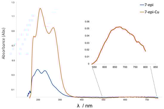 Comparative analyses of the 1H-NMR spectra (Figure 5) of 7-epi-Cu with 7-epi [6] were used to identify the signals corresponding to 8 CH3 (δ 0.6–1.6), 4-CH2 (δ 1.5–3.3), 1-CH (δ 1.0), 3 C=C-H (δ 4.5–5.5), 5 C=C-Haromatic (δ 6.5–7.6) aromatic hydrogen and groups. The signals show a similar feature of paramagnetic spectra with distorted divide in the presence of Cu2+.