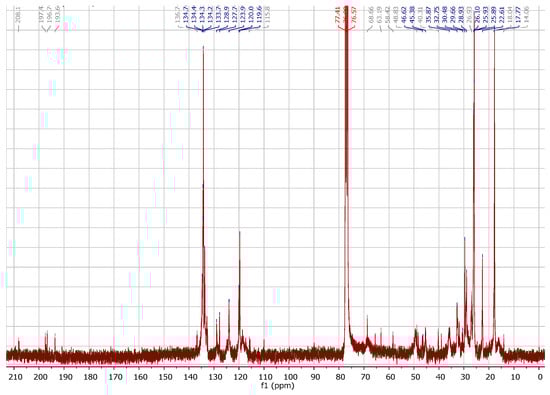 Comparative analyses of the 13C-NMR spectra (Figure 6) of 7-epi-Cu with 7-epi [6] were used to identify the signals corresponding to quaternary (8 sp2 and 2 sp3), methine (9 sp2 corresponding to 7 sp2 and 2 sp3), methylene (3 sp3), and methyl (six attached to 4 sp2 and two bonded to sp3) carbon atoms. Relative to carbonyl groups, were observed at δ 208.1 the non-conjugated carbonyl, and at δ 197.5, 196.7, and 193.6 the system conjugated carbonyl responsible for the complexation with the metal. The other signals were also similar to 7-epi [6].