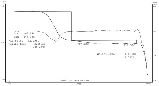 TG was performed in a nitrogen atmosphere. The thermogravimetric curve shows that the complex was anhydrous, due to the existence of a plateau in stability up to 300 °C (Figure 7). Above this temperature, thermodecomposition of the complex began, with a visible loss in mass of 91.64% at 500 °C, which was consistent with the decomposition of the 7-epi ligands (calc. 93.92%). The observed 8.36% residue was tentatively attributed to CuO (7.45%).