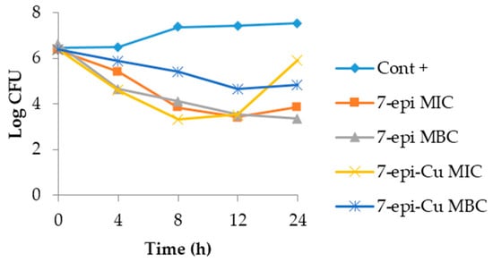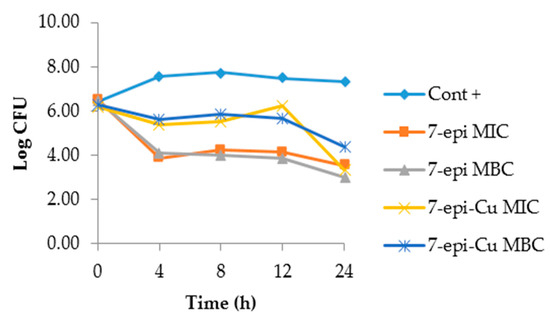 The 7-epi compound and its complex with copper had the same pattern during the observation period where bacterial growth was inhibited. The behavior was similar for the two concentrations tested. This result demonstrates that the behavior of 7-epi and 7-epi-Cu are not time/dose-dependent. Pankey and Sabath [33] described reports of the most important clinical results for drugs with bactericidal activity relative to bacteriostatic agents and found that in vitro results are not sufficient to predict in vivo behavior. Furthermore, drug action is dependent upon the bacterial concentration and interaction with the immune system at the site of infection [34], thus, the bacteriostatic behavior of 7-epi and 7-epi-Cu against these two bacterial species is not a negative feature.