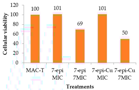 MAC-T viability by MTT assay. MAC-T cells were treated with 7-epiclusianone (7-epi) and 7-epiclusianone-copper (7-epi-Cu) for 24 h at the minimum inhibitory concentration (MIC) and seven times this concentration (7× MIC). The results were presented as cell viability in relation to the control (MAC-T), which was considered 100%.