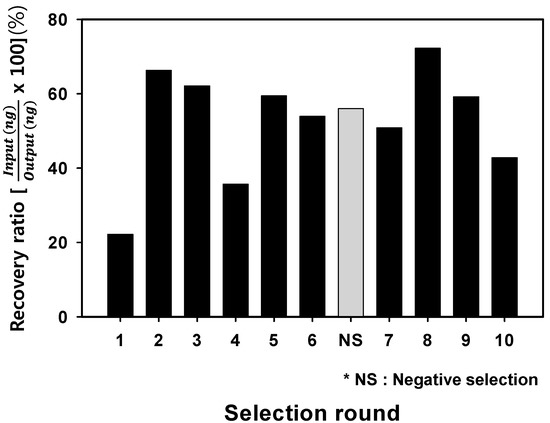 Measurement of eluted aptamers during the SELEX processes. The ssDNA was obtained from each selection round. The recovery ratio was calculated using the amount of input and output DNA concentration through the 10th round of the SELEX processes. The negative selection round (NS) was performed after round 6 to prevent enrichment of non-specific binding aptamers.