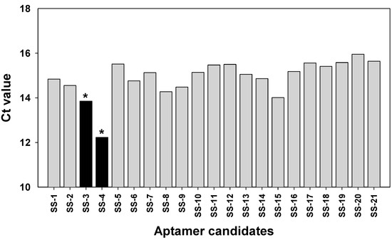 Characterization of binding aptamers. Twenty-one aptamer candidates (SS-1 to SS-21) were analyzed by a post-SELEX method as described in Materials and Method. After incubation with S. sonnei cells, aptamers were retrieved. The eluents were amplified by RT-PCR and the average C(t) values were analyzed in triplicate individual experiments. *: C(t) value < 14.